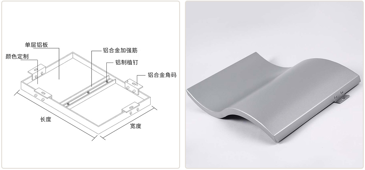 鋁單板采用優(yōu)質(zhì)高強(qiáng)度鋁合金板材,主要由面板、加強(qiáng)筋和角碼組成。加強(qiáng)筋與面板后的電焊螺絲釘連接,使之成為一個牢固的整體,極大增強(qiáng)鋁單板幕墻的強(qiáng)度和剛性,